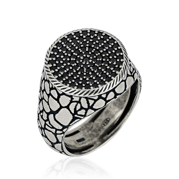 Anello chevalier in argento 925 brunito. Placcatura palladio e oro nero, l’anello ha una texure basolata ed è sormontato da un pavè di spinelli neri.