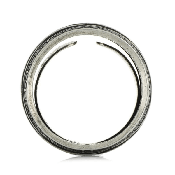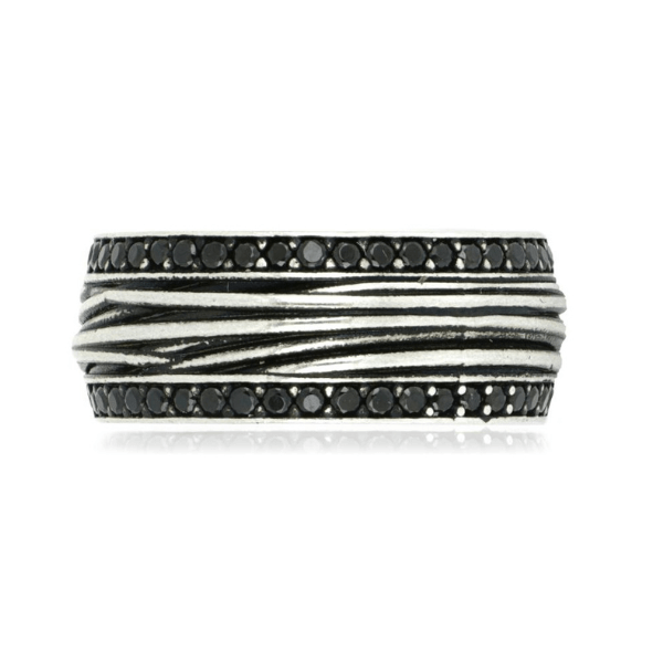 Anello per uomo a fascia larga 10mm! Magic ring all’interno, una molla che garantisce flessibilità e facilità ad indossarlo, copre fino a 4 misure in meno! Texure scanalature, contornata da due riviere a giro in spinelli neri. MIS.26