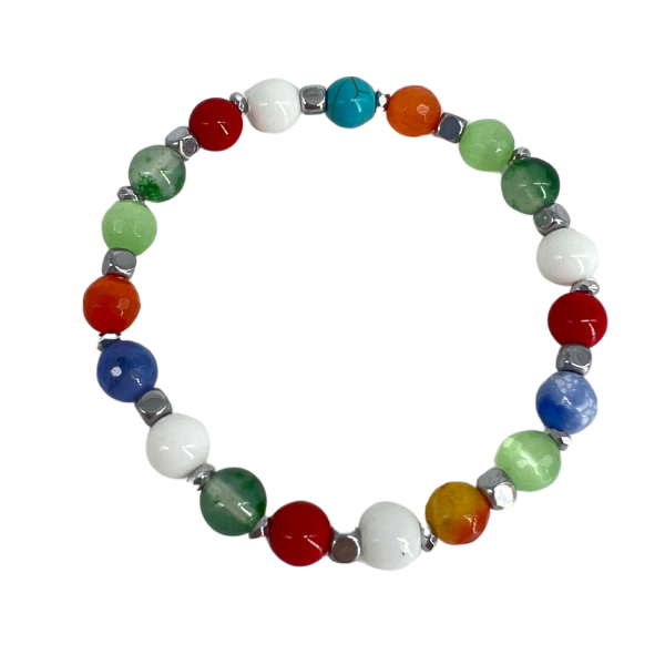Bracciale elastico realizzato completamente a mano con sfere di agate multicolor, corallo stabilizzato, occhio di falco verde e arancione, turchese stabilizzato ed ematite