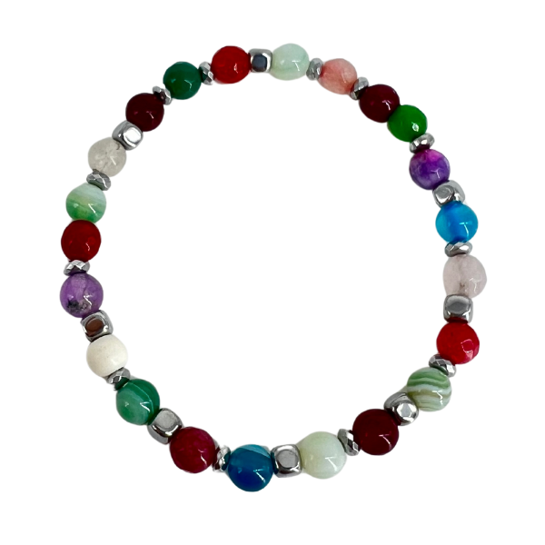 Bracciale elastico realizzato completamente a mano con sfere di agate multicolor ed ematite