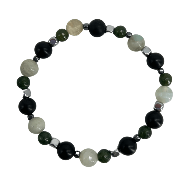 Bracciale elastico realizzato completamente a mano con sfere di agata  multicolor, onice nero opaco ed ematite