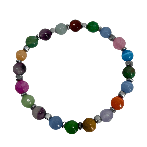 Bracciale elastico realizzato completamente a mano con sfere di agate multicolor, occhio di falco multicolor  ed ematite
