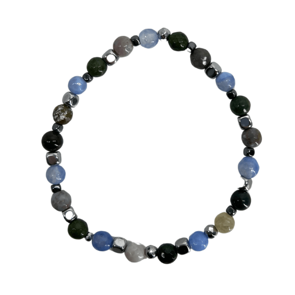 Bracciale elastico realizzato completamente a mano con sfere di agata multicolor, ed ematite