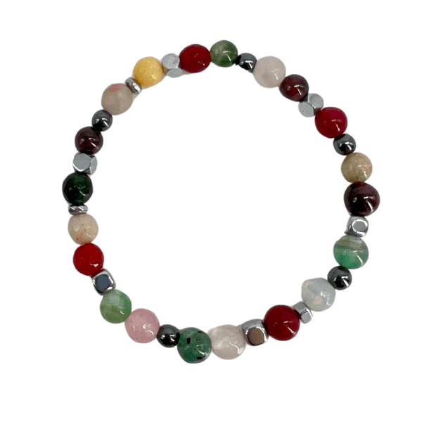 Bracciale elastico realizzato completamente a mano con sfere di agate  multicolor ed ematite