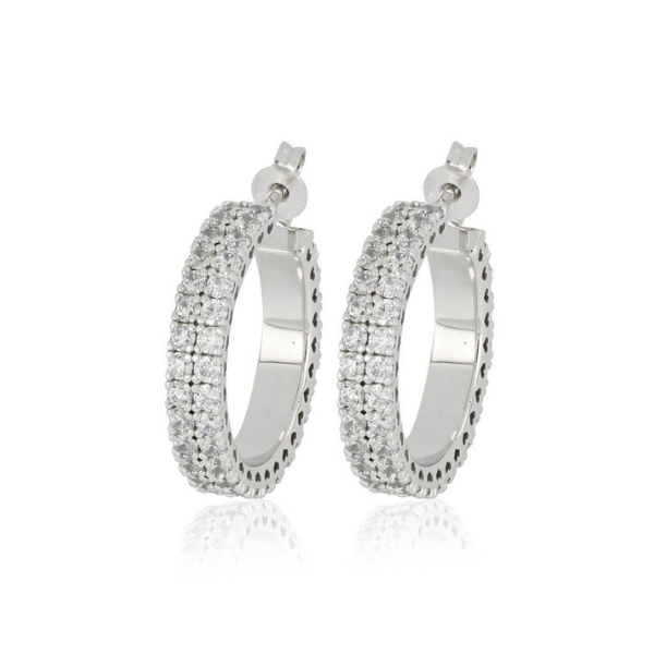 Orecchini a cerchio in argento 925 rodiato con doppia fila di zirconi.